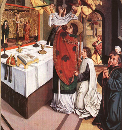 His kindness to the poor is known to the whole Christian world. In the depth of winter, he once met, not far from Amiens, a half-naked beggar, who asked an alms for Christ's sake. Martin had no money with him, but unwilling to send the man away without comfort, he took the cloak from his shoulders, cut it into two pieces and gave one of them to the beggar. His comrades laughed at him, but Martin, in a vision during the following night, saw Christ covered with the piece of the cloak, and heard Him say to the Angels surrounding Him: "Martin, not yet baptized, has covered me with this!" This vision not only comforted Martin greatly, but also induced him to give himself wholly to the service of the Most High. Hence, in his eighteenth year, he received holy baptism, left the army, and, in order to learn how to lead a Christian life, went to the holy bishop Hilarius, who joyfully received him and instructed him in virtue and holiness. Being thoroughly instructed, he went, with the consent of his holy teacher, to Hungary, intending to convert his parents. His mother and many others were easily persuaded to embrace the true faith, but his father proved obstinate. Martin was sorely grieved at this, and desired to remain longer in the hope of yet gaining his father and other heathens; but the Arians drove him away. He therefore returned to his holy master in France. With his consent, he built a small monastery outside the walls of Poitiers, and lived there, with a few disciples, in the practice of austere penance.The fame of his sanctity soon spread far and wide, especially when it became known that he had recalled to life a man who had died before receiving the holy sacrament of regeneration. On account of this and other miracles, Martin was obliged, after the death of the bishop of Tours, to become his successor. Hard as it seemed to the humble servant of God to receive the episcopal dignity, yet he administered his new functions with wonderful zeal and untiring energy. He erected a monastery not far from Tours into which he gathered a community of eighty monks, with whom he lived an extremely severe life. His clergy were instructed by him in such a manner, that they were always able and willing to assist him efficaciously in the care of his flock. With some of these, he visited his entire diocese, preaching everywhere, administering the sacraments, visiting the sick, and giving alms to the poor. He was most earnest in exhorting the faithful to make their churches fit dwelling-places for the Majesty of God, and to behave in them with due reverence. He himself was often seen to tremble when he stood at the entrance of a Church; and being asked the reason of it, he replied: "Shall I not tremble for fear, when appearing before the Highest Majesty, before my God, my Judge?" While at Church he was never seen either sitting or standing, except when his office or the service required it; and unless it was necessary, he never spoke a word while there. He was a shining example of every virtue to all under him, laity as well as clergy.